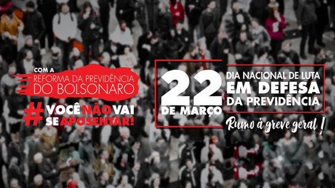 Cuiabá MT - Os trabalhadores e trabalhadoras saem às ruas em todo o Brasil no próximo dia 22 de março - dia Nacional de Luta em Defesa da Previdência. Os bancários e bancárias de Mato Grosso também estão sendo chamados/as para participar. Em Cuiabá, a manifestação será na Praça Ipiranga, a partir das 17h.