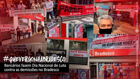 Um dia depois de figurar entre os assuntos mais comentados do Twitter no Brasil com as hashtag #QueVergonhaBradesco e #QuemLucraNãoDemite, os bancários de todo o país voltaram a chamar a atenção nesta quinta-feira (12) com o Dia Nacional de Luta contra as demissões do Bradesco. Manifestações nas portas das agências e dos departamentos do banco Bradesco protestaram contra as demissões realizadas pelo banco neste ano.