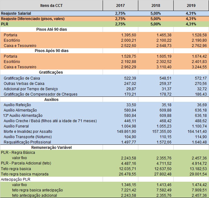 Com o reajuste, os novos pisos de caixa e tesoureiro após a experiência sobem para R$ 3.244,55. O valor do vale-refeição passa a ser R$ 36,69/dia e o vale-alimentação de R$ 636,18/mês.