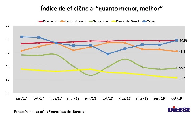 O banco esconde que seu desempenho é melhor do que o dos bancos privados, como mostram os índices de eficiência dos bancos do Banco Central. No gráfico de eficiência fica claro que a liderança do BB é histórica. Também no aspecto tecnológico, o banco se equipara ao mercado e não precisa se “adequar” para competir com os bancos privados.