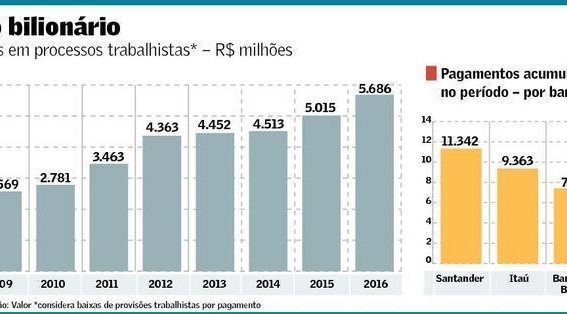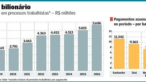 Os quatro maiores bancos de capital aberto do país (Itaú, Banco do Brasil, Bradesco e Santander) tiveram que pagar em caixa quase R$ 35 bilhões como resultado de condenações em ações trabalhistas entre 2008 e 2016, equivalente a 8% da folha de pagamento do período. No fim do ano passado, esses quatro bancos mantinham reservados nos balanços mais R$ 18 bilhões para fazer frente a novos pagamentos de mesma natureza.