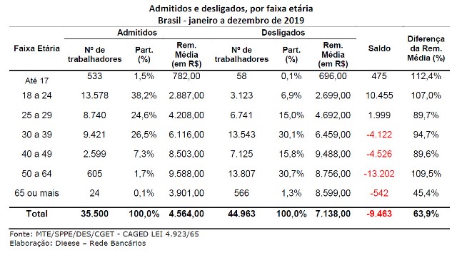 A abertura dos postos bancários ficou concentrada na faixa entre 18 e 29 anos, com criação de 12.454 postos de trabalho. Acima de 30 anos, todas as faixas apresentaram saldo negativo, com destaque para a faixa de 50 a 64 anos, com fechamento de 13.202 postos.