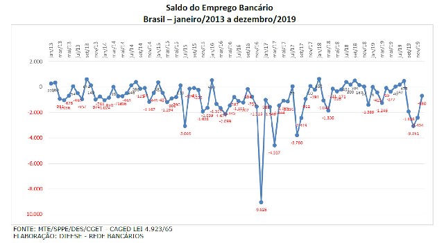 Segundo o Dieese, o setor bancário acumula um saldo de 70.069 postos de trabalho desde 2013, quando os saldos negativos se tornaram uma constante a cada mês. Nestes 96 meses, o saldo foi positivo somente em 23.