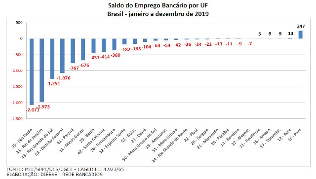 Os estados com as maiores reduções de postos de trabalho do ano foram São Paulo (-2071), Rio de Janeiro (-1.973), Rio Grande do Sul (1.251) e Distrito Federal (-1.076 postos). No Pará, houve maior número contratações do que de demissões e o saldo ficou positivo em 247 postos. Todos os cinco Estados em que houve saldo positivo de emprego no sistema financeiro situam-se na região Centro-Norte: além do Pará, Acre, Rondônia, Amapá e Tocantins.