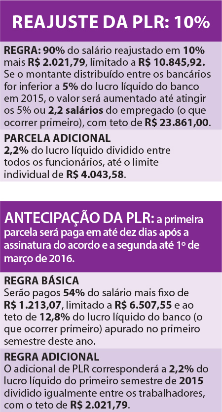 Antecipação da PLR: Pagamento até dez dias após a assinatura do acordo de 54% do salário mais R$ 1.213,07 fixos, limitado a R$ 6.507,55. O restante da PLR será depositada até 1º de março de 2016.