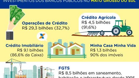 No Mato Grosso do Sul, por exemplo, 86,6% do crédito imobiliário é concedido pela Caixa, que responde ainda por 90% dos recursos do Minha Casa Minha Vida. Os bancos públicos são responsáveis por 32,7% das operações de crédito. Desde 1995 a Caixa investiu R$ 8,5 bilhões do FGTS em saneamento, habitação e infraestrutura no estado.