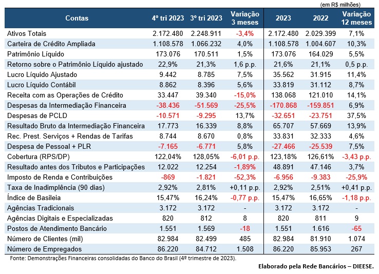 Dados divulgados no relatório produzido pela equipe do Departamento Intersindical de Estatística e Estudos Socioeconômicos (Dieese) sobre os recentes resultados do BB mostram que, ao final de 2023, o BB contava com 86.220 funcionários – aumento de 267 postos de trabalho em 12 meses e 1.508 postos em três meses. Porém, no mesmo período, de um ano, o número de clientes cresceu 1,07 milhão, alcançando 82,98 milhões de consumidores de serviços bancários do BB.