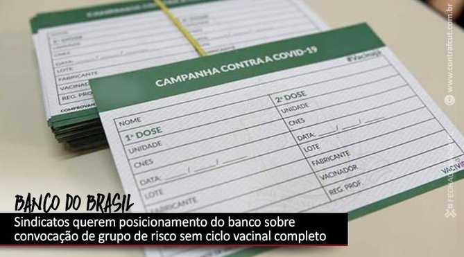Nos últimos dias, o Banco do Brasil passou a convocar os funcionários do grupo de risco, com exceção das gestantes, para o retorno ao trabalho presencial. Nos comunicados anteriores, que vinham sendo feitos ao longo do ano, primeiro “convidando” os funcionários a saírem do teletrabalho e, depois, “convocando-os”, o BB não cobrou o ciclo vacinal completo.