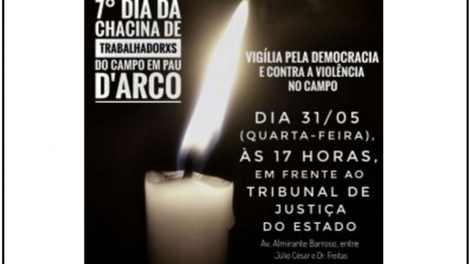 A vigília também vai marcar a passagem do 7º dia do massacre de 10 agricultores no município de Pau D’arco, no Sudeste paraense, a quase 700 quilômetros da Capital. "É uma forma de mostrar que estamos vigilantes e exigimos justiça", observou Ulisses Manaças, liderança nacional do MST. Outras vigílias e atos devem ocorrer, ao mesmo tempo, em outras cidades do Estado, como Santarém, Marabá, Altamira e Parauapebas.