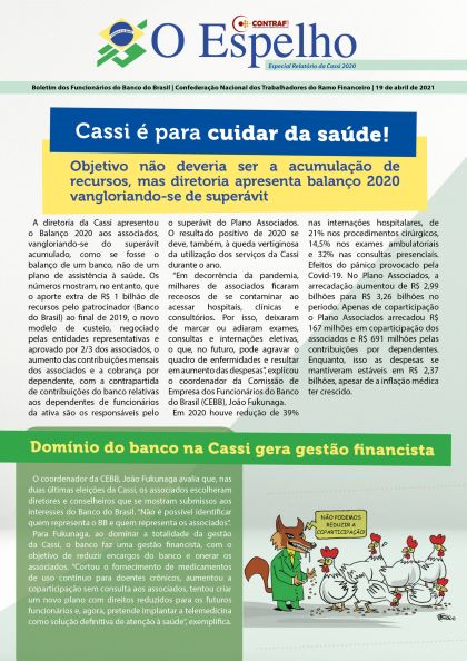 O boletim especial com a posição da Confederação Nacional dos Trabalhadores do Ramo Financeiro (Contraf-CUT) e da maioria dos sindicatos e federações da categoria bancária do país, com críticas às ações de gestão da Cassi está disponível. O material serve de subsídio para a votação do Relatório 2020 da Cassi, que começou nesta segunda-feira e segue até às 18h do dia 28 de abril.