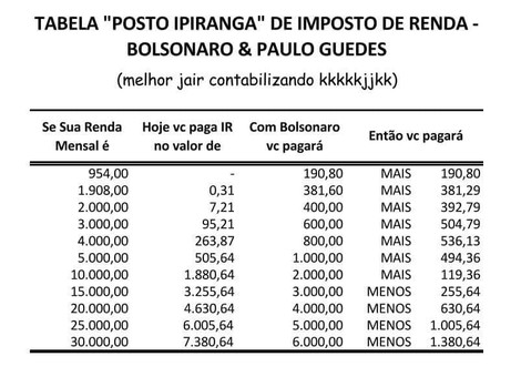 Paulo Guedes se notabilizou durante o primeiro turno da campanha por defender a privatização de todas as empresas públicas e propor alíquota única de 20% para o Imposto de Renda, o que prejudica os assalariados e beneficia os ricos. Veja no quadro como seria o desconto do IR proposto por Guedes.