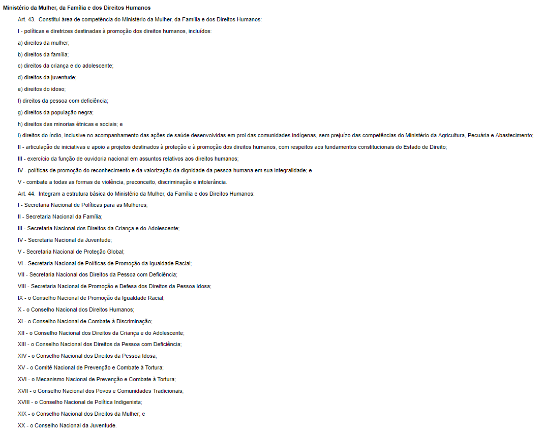 O artigo 43 do decreto, especificando as obrigações do Ministério da Mulher, fala ainda em "direitos da família" e das "minorias étnicas e sociais", incluindo os indígenas. A mesma edição do Diário Oficial, entretanto, mostra que Bolsonaro também assinou uma MP retirando da Fundação Nacional do Índio (Funai) e do Instituto Nacional de Colonização e Reforma Agrária (Incra) a identificação e demarcação de territórios indígenas e quilombolas.