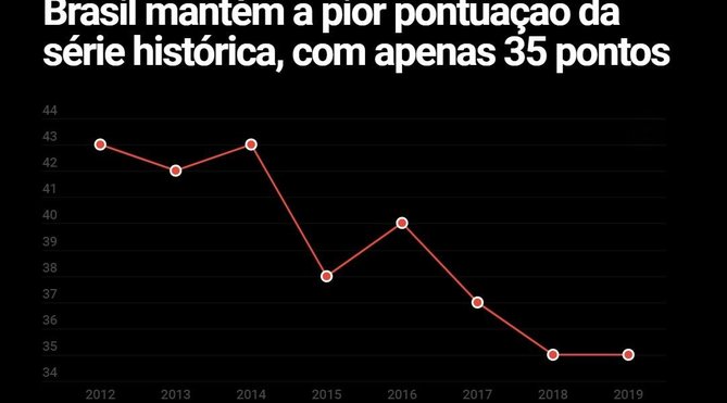 O Brasil se manteve no pior patamar em ranking mundial de percepção sobre combate à corrupção no setor público, pelo segundo ano consecutivo, de acordo com o Índice de Percepção da Corrupção (IPC) 2019. Com apenas 35 pontos, o pior resultado desde 2012, o país está atrás de outros como Sri Lanka, Vietnã, Timor Leste, Etiópia, Arábia Saudita e Colômbia.