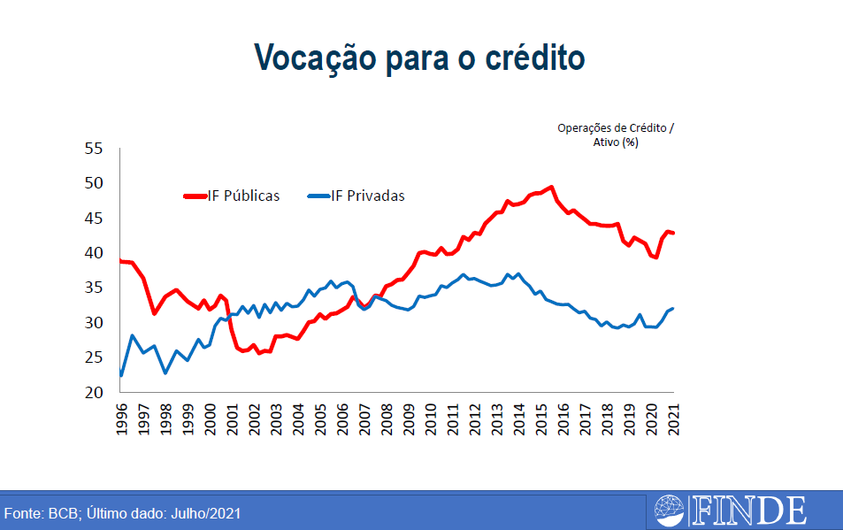 “Estou sendo enfática com relação à atuação dos bancos públicos porque são eles que, quando o dinheiro está disponível, oferecem crédito ao setor produtivo e não apenas o retém para gerar recursos aos rentistas”, disse apresentando um gráfico que compara a vocação para o crédito das instituições públicas e das privadas.