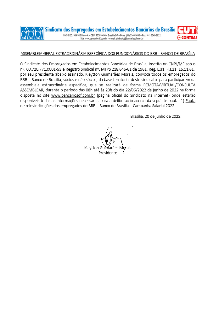 “Convoco todas as bancárias e bancários a participarem da live e da assembleia. Precisamos de grande união e maciça participação na campanha salarial que possibilite o melhor resultado possível, na busca ao atendimento das justas reivindicações dos trabalhadores e trabalhadoras bancários do BRB. Os balanços dos bancos evidenciam a absoluta capacidade de atendimento às reivindicações. Porém a vitória só virá com a responsabilidade e contribuição de todos e de cada um nesta construção. Não podemos terceirizar nosso papel na luta por melhores condições de salário e de trabalho” afirma Kleytton Morais, presidente do Sindicato.