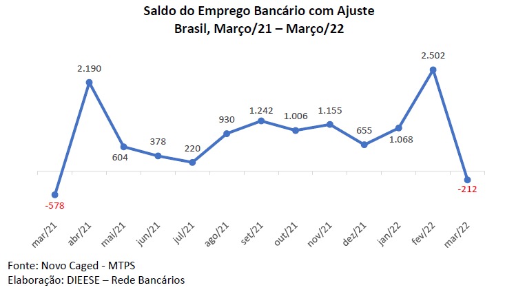Após 11 meses de resultados positivos, o setor bancário apresentou, no mês de março, queda no emprego formal de 212 postos de trabalho (2.892 admissões e 3.103 desligamentos). Nos últimos 12 meses, o saldo ainda é positivo, em 11,7 mil postos, impactado pela contratação de profissionais de tecnologia da informação, vagas não ligadas diretamente a serviços bancários, e pela convocação, pela Caixa Econômica Federal, de aprovados no concurso de 2014, seguindo ordem judicial.