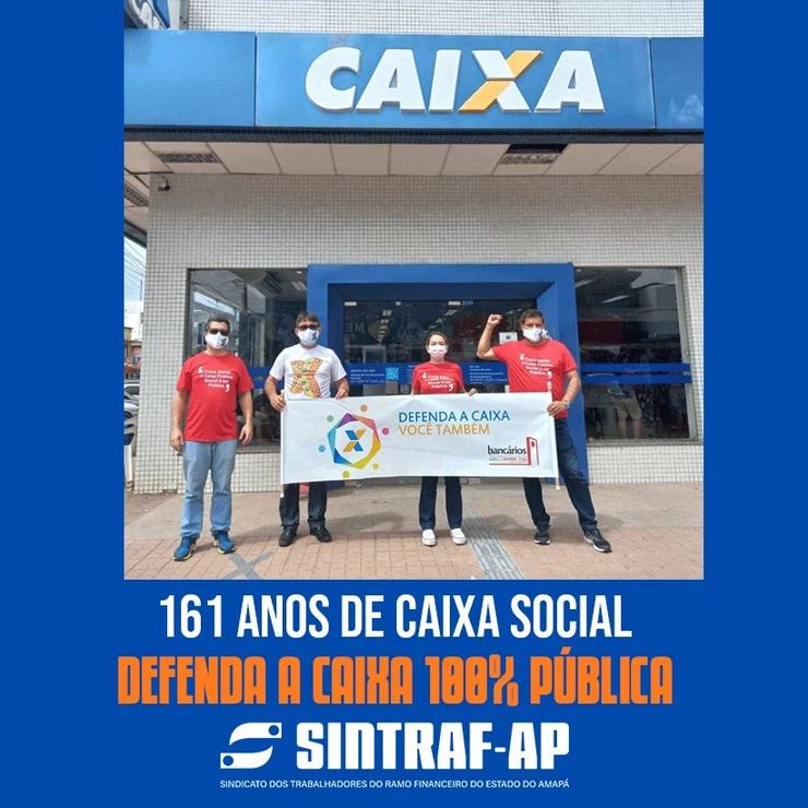 Nesta quarta-feira (12/01), a Caixa Econômica Federal completa 161 anos de existência, com atividades voltadas para o desenvolvimento econômico e social do Brasil, das pessoas que mais precisam do banco público federal. Os parabéns são para a instituição e seus mais de 80 mil empregados e empregadas, que ao longo de sua história vêm cumprindo suas funções com total dedicação e respeito ao papel para o qual a Caixa foi criada. A luta agora é contra o desmonte e a privatização do banco 100% público que está ao lado da população em diversos setores, como a habitação, saneamento, esportes, educação etc.