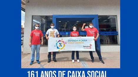Nesta quarta-feira (12/01), a Caixa Econômica Federal completa 161 anos de existência, com atividades voltadas para o desenvolvimento econômico e social do Brasil, das pessoas que mais precisam do banco público federal. Os parabéns são para a instituição e seus mais de 80 mil empregados e empregadas, que ao longo de sua história vêm cumprindo suas funções com total dedicação e respeito ao papel para o qual a Caixa foi criada. A luta agora é contra o desmonte e a privatização do banco 100% público que está ao lado da população em diversos setores, como a habitação, saneamento, esportes, educação etc.