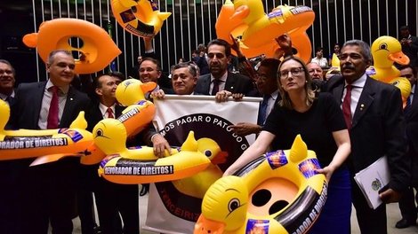 Parlamentares da oposição fizeram um protesto com patos infláveis, referência ao símbolo de manifestações contra a corrupção capitaneadas pela Federação das Indústrias do Estado de São Paulo (Fiesp). "Pato corrupto, pato golpista", disse Chico Alencar (Psol-RJ). E também menção ao fato de o trabalhador, com o projeto, estar "pagando o pato", com uma lei que possivelmente irá prejudicá-los.