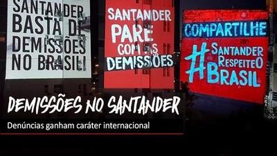 Sindicatos de todo o país estão em campanha contra as demissões realizadas pelo banco Santander. No dia 16 de junho, um tuitaço com a hashtag #SantanderRespeiteOBrasil foi um dos assuntos mais comentados no Twitter. No mesmo dia também ocorreram manifestações em frente de diversas agências. Nos dias 18 e 19, projeções em prédios de diversas capitais colocaram o tema em evidência em vários veículos e comunicação e mostraram um pouco da verdadeira face do banco para a sociedade.