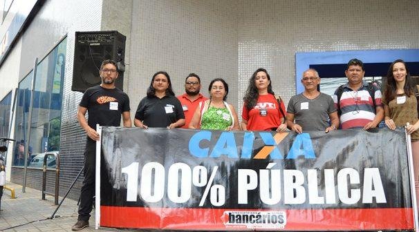 Belém PA - No mesmo dia e hora em que um consórcio de capital estrangeiro vencia o leilão da Lotex com proposta única, dirigentes do Sindicato defendiam a Caixa 100% pública, bem como os serviços oferecidos por ela em todo o país. A manifestação, em forma também e panfletagem, foi em frente ao Edifício Sede da Caixa em Belém no final da manhã desta terça-feira (22).