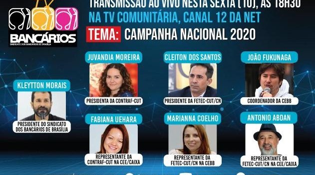 Iniciada a organização da categoria para a Campanha Nacional dos Bancários 2020, o programa TV Bancários desta sexta-feira (10) recebe virtualmente representantes dos trabalhadores do âmbito distrital e nacional para debater as principais reivindicações dos bancários para a renovação dos acordos coletivos. O programa vai ao ar às 18h30 pela TV Comunitária de Brasília (canal 12 da Net) e pela página do Sindicato no Facebook.