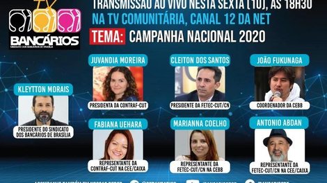 Iniciada a organização da categoria para a Campanha Nacional dos Bancários 2020, o programa TV Bancários desta sexta-feira (10) recebe virtualmente representantes dos trabalhadores do âmbito distrital e nacional para debater as principais reivindicações dos bancários para a renovação dos acordos coletivos. O programa vai ao ar às 18h30 pela TV Comunitária de Brasília (canal 12 da Net) e pela página do Sindicato no Facebook.