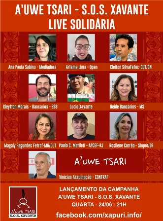A presidenta do Sindicato dos Bancários de Campo Grande, Neide Rodrigues, também participou da segunda live, mediada por Ana Paula Sabino, assessora da Frente Parlamentar Mista em Defesa dos Povos Indígenas. Também estiveram presentes no lançamento da campanha A'UWE TSARI – SOS XAVANTE Vinícius Assunção, vice-presidente da Contraf-CUT; Artema Lima, da Operação Amazônia Nativa (Opan); Lúcio Xavante, secretário executivo da Federação dos Povos Indígenas do Mato Grosso (Fepoimt); Rosilene Corrêa, diretora do Sinpro-DF e dirigente da Confederação Nacional dos Trabalhadores em Educação (CNTE); Magaly Fagundes, presidente da Federação dos Bancários de Minas (Fetrafi MG); e Paulo Matileti, diretor do Sindicato dos Bancários do Rio de Janeiro.