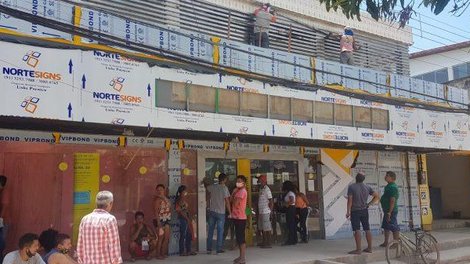 A obra que está com o prazo de conclusão atrasado há pelo menos dois meses acontece em pleno expediente bancário. A copa da agência virou uma das salas de atendimento, parte do piso ainda não foi instalado e poeira está por todo canto.
