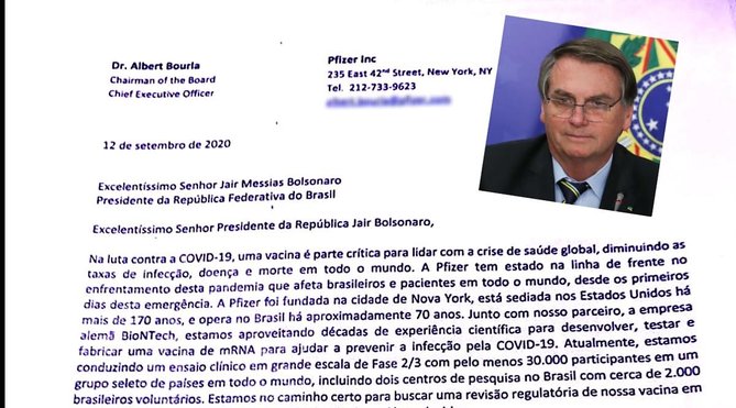 “Quero fazer todos os esforços possíveis para garantir que doses de nossa futura vacina sejam reservadas para a população brasileira, porém celeridade é crucial devido à alta demanda de outros países e ao número limitado de doses em 2020”, diz a carta, assinada pelo presidente mundial da Pfizer, Abert Bourla. O documento ficou sem resposta mesmo tendo sido enviado também ao vice-presidente, Hamilton Mourão); ao então ministro da Saúde, Eduardo Pazuello; ao ministro da Economia, Paulo Guedes; ao chefe da Casa Civil, Walter Braga Netto; e ao embaixador do Brasil para os Estados Unidos, Nestor Forster.