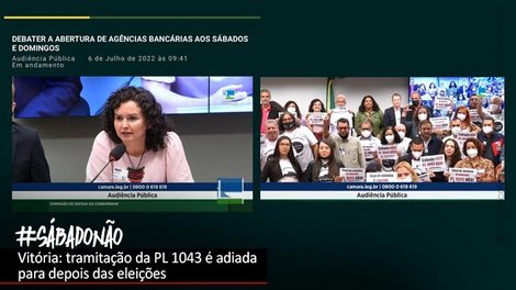 O presidente da Comissão de Defesa do Consumidor (CDC), da Câmara dos Deputados, deputado Sílvio Costa Filho, decidiu que o Projeto de Lei (PL) 1043/2019, que libera a abertura dos bancos aos sábados e domingos, somente voltará a ser debatido e encaminhado à votação após o período eleitoral. A deliberação ocorreu nesta quarta-feira (6), ao final de audiência sobre a matéria, realizada a pedido da Confederação Nacional dos Trabalhadores do Ramo Financeiro (Contraf-CUT) e demais entidades sindicais.