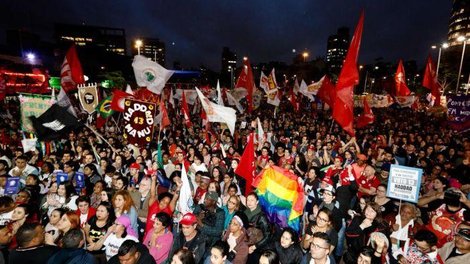 Ao som das baterias do ‘Levante Popular e da Frente Brasil Popular’’ e com gritos de guerra: ‘Eu tô com ele, eu tô com ela, eu tô com Lula, Haddad e Manuela’, os manifestantes demonstravam acreditar na virada da coligação ‘O Brasil Feliz de Novo’.