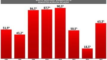 São Paulo – Com inflação menor, a maioria das campanhas salariais pesquisadas pelo Dieese em 2017 teve reajuste acima da inflação. Foram 63,3% das campanhas com ganho real, ante 28,6% com aumentos equivalentes à variação do INPC e 8,1% abaixo. O desempenho é melhor do que no ano anterior, mas está distante do período 2006-2014 – em que os ganhos reais estiveram presentes em perto de 90% dos acordos (confira tabela ao lado). E os resultados menos já são menos favoráveis no último trimestre, contrariando o discurso da "retomada" econômica.