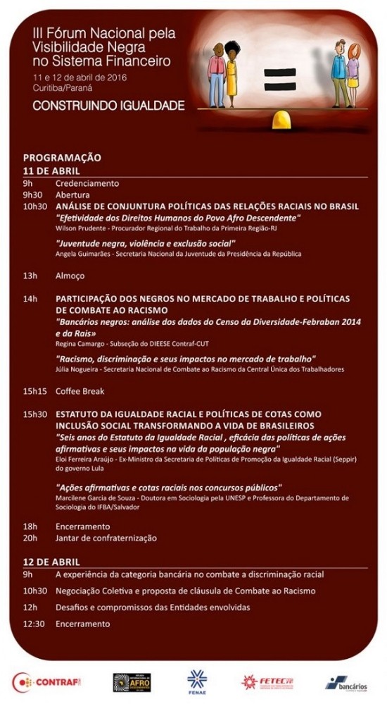 Começou nesta segunda-feira (11) o III Fórum Nacional pela Visibilidade Negra no Sistema Financeiro, que está sendo realizado em Curitiba (PR). Bancários de todo o país estão reunidos para debater as práticas discriminatórias que favorecem somente aqueles que, hegemonicamente, detém o capital, segregando e precarizando as relações e as condições de trabalho na sociedade, a fim de concentrar riquezas.