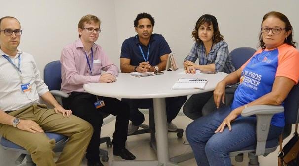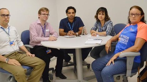 Belém PA - A cada dois meses os membros do Comitê da Rede Credenciada do Saúde CAIXA reúnem-se para acompanhar o atendimento que vem sendo oferecido, pelo plano, aos titulares e dependentes em todo o Pará e Amapá. Na manhã da última quinta-feira (16), representantes da categoria (Heider Alberto, diretor do Sindicato e Ana Alice de Souza, da Associação dos Aposentados) e do banco (Patrícia Sousa,TBN da GIGOV BE, Rafael Mesquita, assistente regional da SR Norte do Pará e Guilherme, supervisor do Saúde CAIXA), encontraram-se para a terceira reunião do ano.