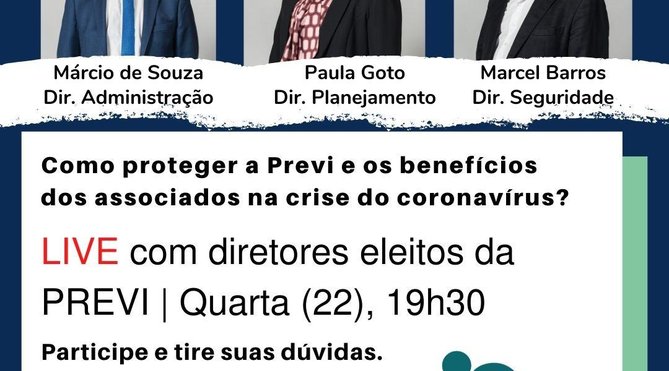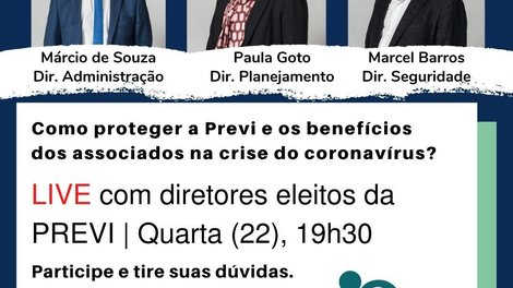 Os diretores eleitos da Previ fazem nesta quarta-feira 22 de abril, às 19h30, uma live na página Associados Previ do Facebook e do Youtube, com o tema “Como proteger a Previ e seus associados em tempos de pandemia e de crise econômica”. Os diretores eleitos Marcel Barros (Seguridade), Paula Goto (Planejamento) e Márcio de Souza (Administração) vão conversar com os associados do Plano 1 e do Previ Futuro e tirar dúvidas sobre os impactos da crise nos investimentos do fundo de pensão.