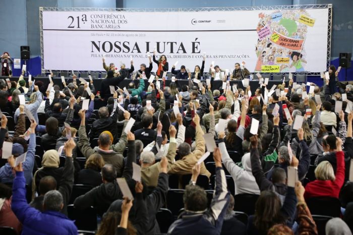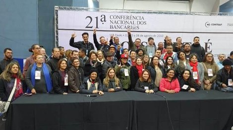 A 21º Conferência Nacional dos Bancários aprovou neste domingo 4 de agosto as resoluções que vão nortear o movimento sindical bancário no próximo período, assim como um calendário de lutas neste semestre. Os textos são resultado dos debates acumulados nas conferências estaduais e regionais e durante os três dias de evento, que reuniu mais de 600 delegados sindicais, 395 homens e 209 mulheres, na quadra do Sindicato dos Bancários de São Paulo. Os bancários do Centro-Norte foram representados por 68 delgados. A Conferência foi precedida do 30º Congresso Nacional dos Funcionários do Banco do Brasil e do 35º Congresso dos Empregados da Caixa Econômica Federal.