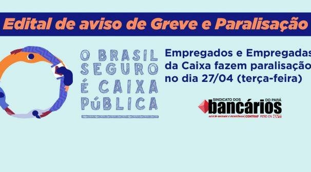 O SINDICATO DOS TRABALHADORES E TRABALHADORAS DO RAMO FINANCEIRO DO ESTADO DO PARÁ, neste ato representado por sua presidenta, para cumprimento das exigências contidas na Lei nº 7.783/89, avisa aos usuários dos serviços e a população em geral, que os empregados pertencentes à categoria bancária que prestam serviços à Caixa Econômica Federal, em assembleia realizada em 22.04.2021, deliberaram por decretar Estado de Greve e indicar a paralisação de suas atividades a partir da 00h até às 23h59 do dia 27.04.2021, a critério da diretoria do sindicato, que comunicará por seus meios de comunicação a manutenção ou não da paralisação até o dia 26 de abril de 2021.