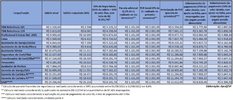 Confira, abaixo, a tabela com o cálculo dos valores estimados para a antecipação da PLR. Os cálculos foram feitos considerando que o INPC do período (que reajusta a parcela fixa e o teto da Regra Básica) fechou em 8,8% e considerando também os dados publicados no balanço semestral da Caixa para o cálculo da parcela adicional e da PLR Social (R$ 4,7344 bi de lucro e 87.401 empregados).
