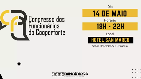 O Sindicato de Brasília realizará, no dia 14 de maio, o Congresso dos Funcionários da Cooperforte, com o objetivo de debater as pautas específicas da categoria e construir, de forma coletiva, a minuta de reivindicações para o próximo período de negociação.
