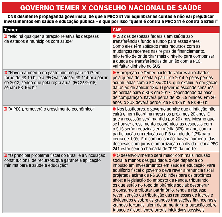 São Paulo – O presidente do Conselho Nacional de Saúde (CNS), Ronald Santos, apresentou hoje (20) argumentos que desmentem a propaganda do governo de Michel Temer (PMDB) em defesa da Proposta de Emenda à Constituição (PEC) 241, que congela investimentos federais por 20 anos e desobriga a União de repassar a estados e municípios percentuais estabelecidos pela Constituição para o financiamento de ações na área de saúde e educação, colocando em risco o Sistema Único de Saúde (SUS).