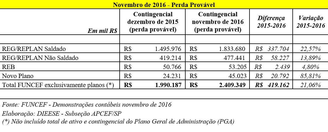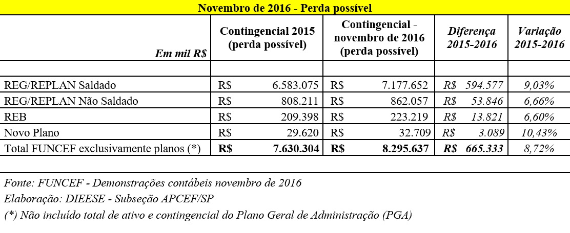 Além das cifras provisionadas, outra quantia ainda maior virá à tona em breve. É o chamado contencioso de perda possível, ou seja, as causas com probabilidade de execução avaliada em 50%, cuja provisão não é obrigatória. Notas explicativas emitidas pela Funcef informam que, em dezembro de 2015, essas ações somavam R$ 7,6 bilhões, enquanto em novembro de 2016 já atingiram R$ 8,2 bilhões, alta de 8,72%. A metade dessas causas terminará em condenação, logo, já são mais R$ 4,1 bilhões na conta. Ao todo, portanto, o prejuízo do contencioso é de R$ 6,5 bilhões.