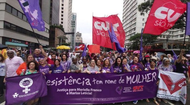 Milhares de mulheres, espalhadas por todo o Brasil, saíram às ruas durante todo o domingo (08) por igualdade de direitos e contra a violência. Os atos aconteceram em diversas cidades do país desde o início da manhã. Os principais temas foram o fim da violência contra a mulher, fora Bolsonaro e direitos iguais. O assassinato da vereadora Marielle Franco, que completa dois anos no dia 14 de março, também foi relembrado em diversas manifestações.