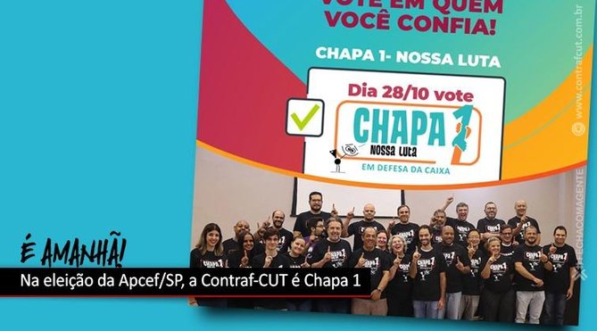 Se aproxima o dia em que os empregados da Caixa do estado de São Paulo vão escolher a nova gestão da Apcef/SP para o triênio 2020/2023. Diante deste importante processo eleitoral, que será realizado nesta quarta-feira (28/10), a Confederação dos Trabalhadores do Ramo Financeiro (Contraf-CUT) destaca o apoio à Chapa 1 Nossa Luta – atualmente à frente da entidade – por representar a força do coletivo dos empregados da Caixa, e pela sua destacada atuação na defesa dos direitos dos trabalhadores e da Caixa 100% pública.
