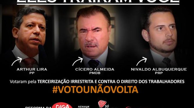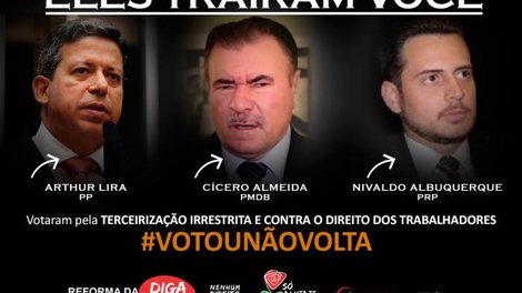 A Contraf-CUT disponibiliza, a partir desta quarta-feira (12), arte para os sindicatos e federações denunciarem à população os deputados que votaram pela aprovação da terceirização. O material está aberto para que as entidades colem as fotos os parlamentares da sua região.
