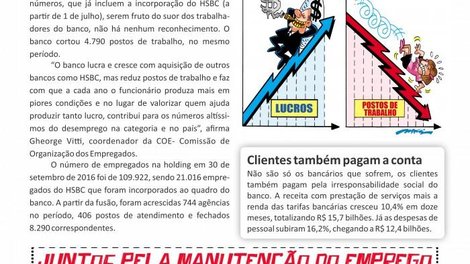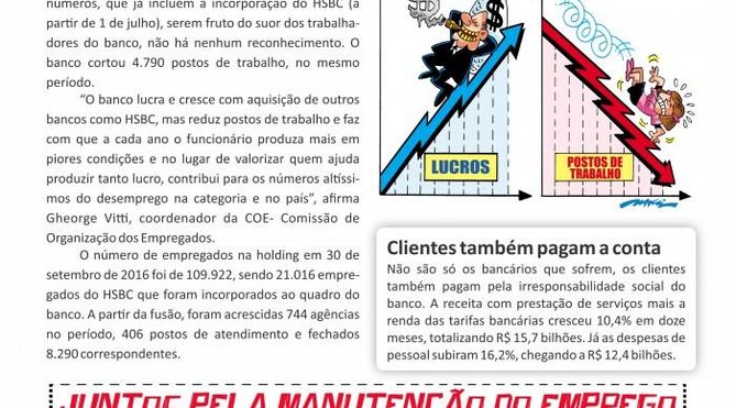 “O banco lucra e cresce com aquisição de outros bancos como HSBC, mas reduz postos de trabalho e faz com que a cada ano o funcionário produza mais em piores condições e no lugar de valorizar quem ajuda produzir tanto lucro, contribui para os números altíssimos do desemprego na categoria e no país”, afirma Gheorge Vitti, coordenador da COE- Comissão de Organização dos Empregados.