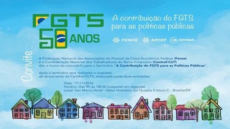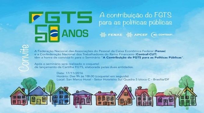 A Contraf-CUT e a Fenae (Federação Nacional das Associações de Pessoal da Caixa Econômica Federal) estão realizando uma série de atividades, entre elas o seminário “A CONTRIBUIÇÃO DO FGTS NAS POLÍTICAS PÚBLICAS”, em comemoração aos 50 anos da criação do Fundo de Garantia por Tempo de Serviço - FGTS. O evento acontece em Brasília, no dia 17 de novembro e reunirá sindicalistas, parlamentares e representantes de diversas entidades para discutir o tema.