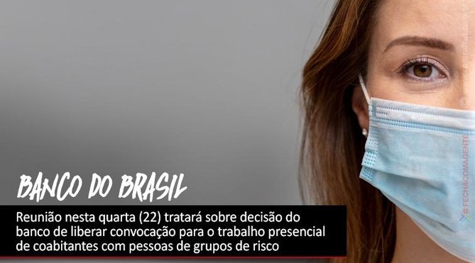 O Banco do Brasil emitiu nesta terça-feira (21) um comunicado com “orientações aos gestores” sobre as medidas adotadas pelo banco em decorrência da pandemia causada pelo novo coronavírus. Em um trecho do documento, o banco informa que os funcionários que se autodeclararam coabitar com pessoas pertencentes a algum grupo de risco para a Covid-19 passam, a partir de 27/07/2020, podem ser enquadrados nas formas de trabalho disponíveis, como os demais funcionários que não pertençam ao grupo de risco. A Comissão de Empresa dos Funcionários do Banco do Brasil (CEBB), órgão da Contraf-CUT, se reúne com o banco nesta quarta-feira (22), às 14h30 para tratar do assunto.