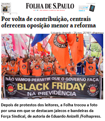Para terminar, uma confusão grave na divulgação da matéria na internet: a Folha juntou ao texto do jornal impresso uma foto dos protestos de 15/3 em que o grande destaque são as bandeiras da CUT. É óbvio que quem só lê a manchete e vê a foto pensa que a CUT está fazendo acertos espúrios com Temer. Após protestos dos leitores contra essa deturpação, o jornal trocou a foto por uma em que se destacam jalecos e bandeiras da Força Sindical.