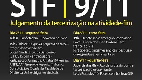Na programação da vigília estão previstas panfletagem para esclarecer a população sobre os danos da precarização da terceirização, com subcontratações sem limites, debates e, para fechar o calendário, ato em frente ao STF. (Veja abaixo programação completa)